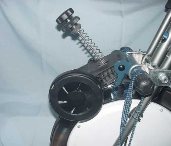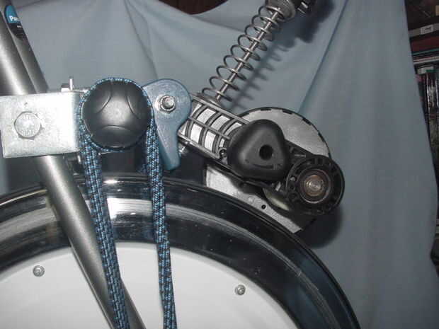 3. Instale ambos 36" cuerdas del amortiguador auxiliar plana. A cada lado, gancho basan de ambos extremos de una cuerda del amortiguador auxiliar a la bicicleta estacionaria y hacen un lazo único alrededor del tubo de soporte de montaje.