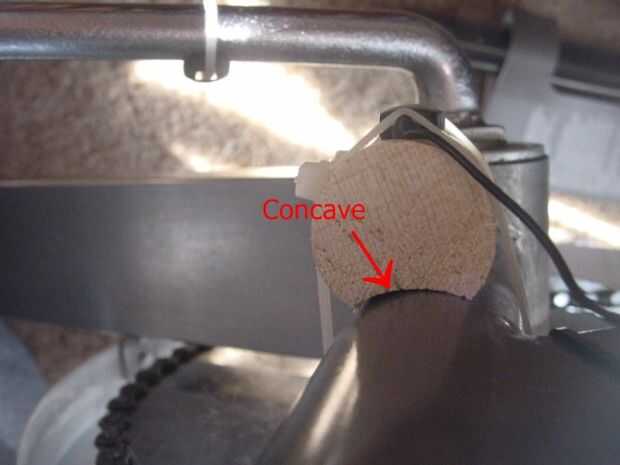 2. cortar a un espaciador (pasador de diámetro de 1-1/4 pulgada) 2-1/2 pulgadas de largo. Presentar un canal cóncavo de 3/4 pulgadas de ancho a lo largo de la dimensión larga de la espiga con una lima de media caña o escofina.