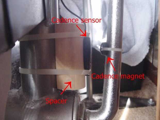1. el sensor de cadencia y el imán se encuentra en el lado de la bicicleta frente a la cadena. Sin embargo, hay demasiada distancia entre el brazo de la biela y el tubo del asiento para el sensor detectar el imán. Un espaciador debe ser hecha.