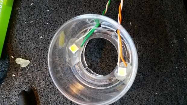 Los leds en el borde del pegamento. usé pegamento estupendo al principio. No funcionaba por lo que he utilizado pegamento caliente. Conseguir los cables por los agujeros. Si no tienes ningún agujero... les perfore.