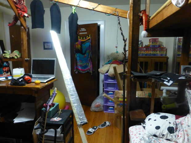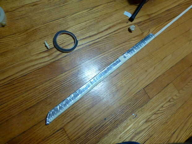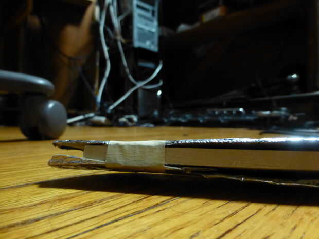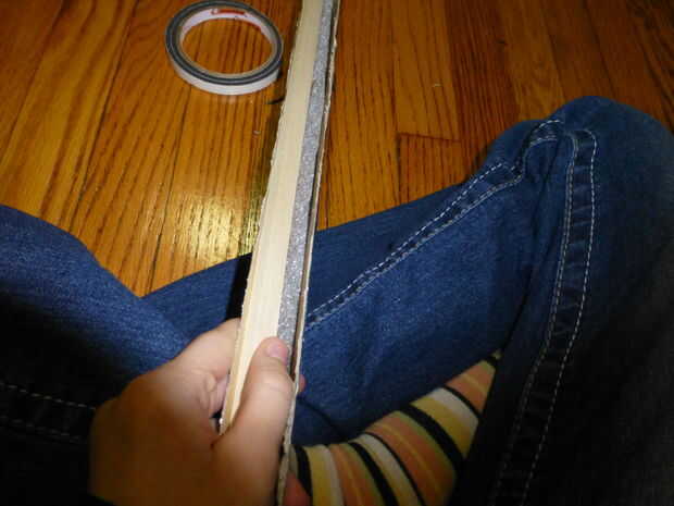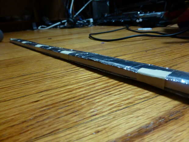 Hasta la madera con la parte abierta de la lámina y la cinta (con cinta de enmascarar) los dos lados juntos. Dejar un pequeño espacio de la punta donde no hay ninguna madera (no dejar suficiente). Asegúrese de presionar la madera en la cinta para que permanezca en su lugar y asegurarse con cinta adhesiva los lados juntos apretados (seguro). Iniciar grabación a intervalos y luego eventualmente cubrir todo el lateral con cinta.
