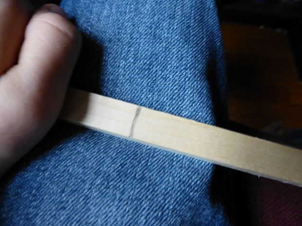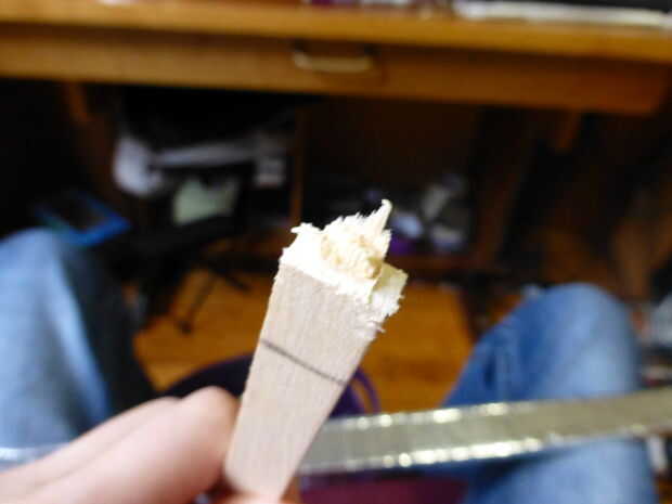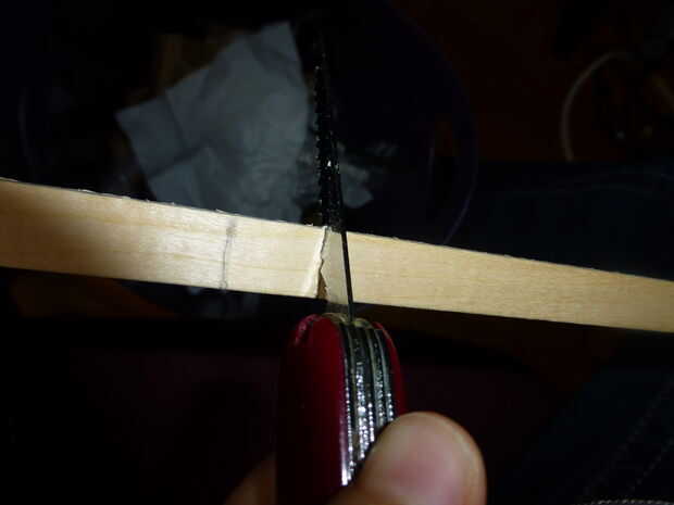Encontrar una manera de cortar la espiga en la marca. Empecé con un cuchillo de la caja, puesto que era la opción de usar una sierra, en el momento, de carácter. Rápidamente me di cuenta de que si no quería pasar el resto de mi vida sierra a través de un trozo de madera, tendría que encontrar un método diferente. Decidí que me gustaría probar una sierra de cuchillo de bolsillo. Sí, una navaja de sierra; supuestamente una de las herramientas más inútiles que puedes tener - el obtuso agudo lo en la historia de sharp (o al menos así es cómo funciona en mi cuchillo de bolsillo). Pero funciona: el filo embotado como es, ayuda a enormemente. Finalmente la espiga sobrante sólo interrumpió en su propio. Pero espere: Mantener el extra poco de tang, usted necesitará en un momento.