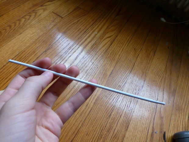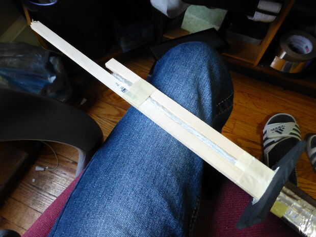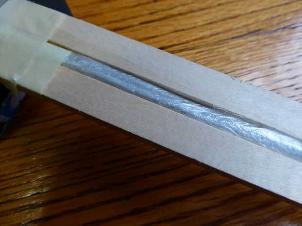 Este paso es más difícil de documento ya que tiene una buena dosis de improvisación. Vas a la cinta el aserrado trozo de espiga hacia atrás por como se ve en las fotos, con espiga de un "separador" entre él y la hoja. Realmente puede usar cualquier cosa que sea del tamaño correcto como el separador (ver las fotos para ideas sobre el tamaño), pero usé un corte hasta el hangar de alambre de una pieza dañada para un proyecto pasado y algún abrigo de saran. El hangar se corta en trozos alrededor de la longitud correcta y envolver a cuatro de ellos juntos en el abrigo de saran hizo un espaciador que era del tamaño adecuado y bastante fuerte. Había grabado al espaciador a la espiga y luego grabó el aserrado pieza tanto de aquellos que, como se ve. Esta loco el "núcleo del mango" el mismo ancho que la hoja. Serrar el poco exceso de «fundamentales».