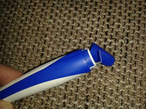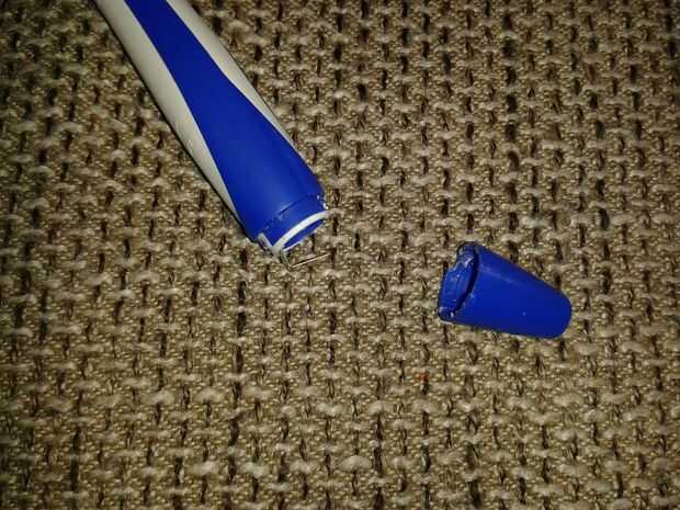 De este orificio, una batería de AAA se deslizó hacia fuera. Me di cuenta de que, si esto reemplacé con una de las recargables que tengo ahí, podría resucitar este cepillo de dientes si pude encontrar una manera de reemplazar la cabeza.