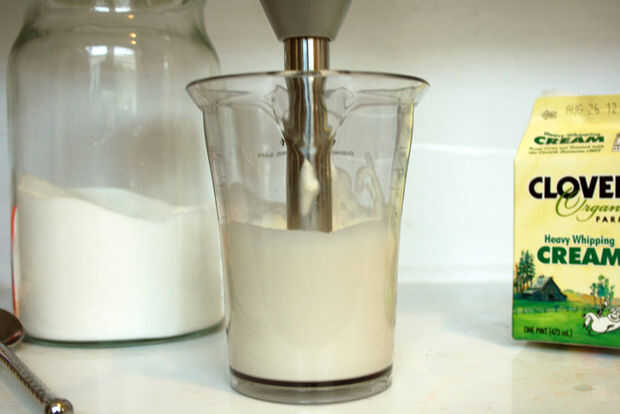 Frappuccinos vienen con algo que se llama "látigo" en la parte superior. Lo sé porque he oído el ambiente * $s baristas pedir los clientes si "quieren que con el látigo". Tomé esto es algún tipo de crema batida. Para simular "látigo", confunden algunos pesados batir con un poco de azúcar. Puede utilizar leche en lugar de otro. Si no tienes una batidora de inmersión, hará un batidor.
