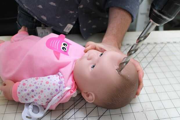 Para hacer una abertura para la mordedura de la boca tendremos que taladrar un agujero en la cabeza de la muñeca. La cabeza es suave y hueco, así que esto es bastante fácil. Perfore la carne de cabeza de bebé suave con una broca de gran diámetro.