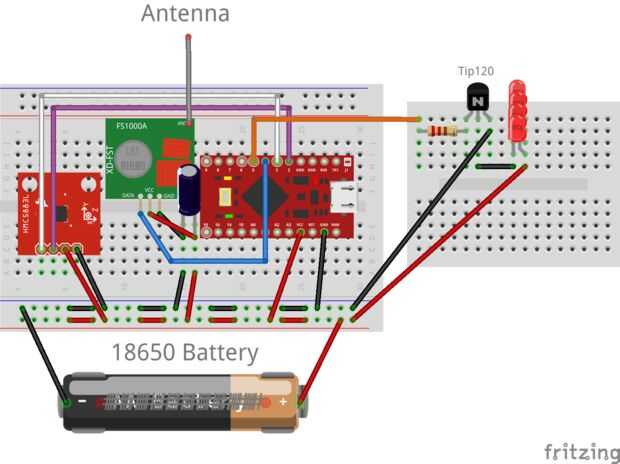 Este es el esquema que construirá. Cuando la radio envía las señales de necesita una gran cantidad de corriente durante un corto periodo de tiempo, pero es más de lo que puede proporcionar la batería. Colocar un condensador a la emisora radio fija los problemas que tuve con la radio.