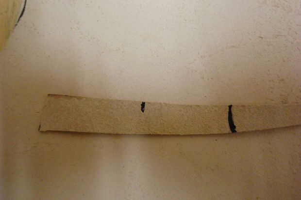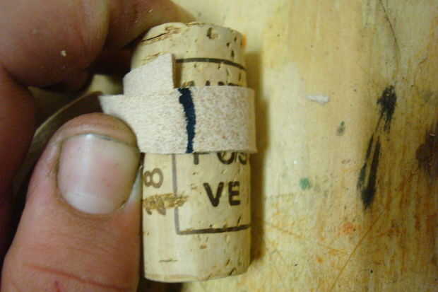 esto es importante, usted quiere el corcho que ajuste bien, por lo que necesitará hacer las cosas bien. Marcar donde quieres coser hasta alrededor del corcho con este método. Tomar una tira de cuero, abrigo alrededor del corcho, marcar donde se encuentra con sí mismo y marca la mitad de esa distancia. De esta forma que tienes la mitad de la circunferencia del corcho. Esta es la distancia que quieras en el frasco. Vaya por delante y también marca la zona que dejo plana también.