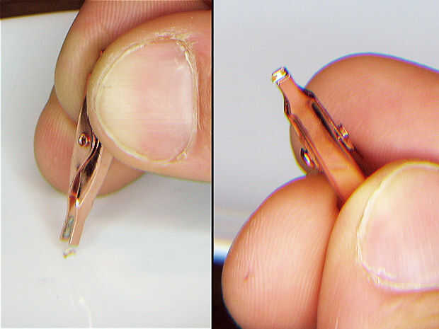 Usando un microclip, recoger un LED para que la parte inferior quede hacia fuera, exponiendo las almohadillas.