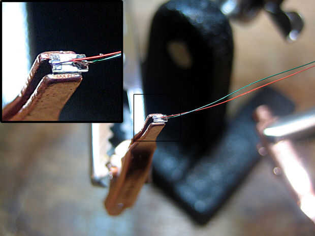 Utilizando un soldador a alrededor de 260 grados C, recoger una gota muy pequeña de soldadura fundida sobre la punta de la plancha y, muy suavemente, tocar la punta de la plancha a la almohadilla de cátodo en el LED. Una pequeña cantidad de soldadura se debe ejecutar inmediatamente fuera de la punta y en la almohadilla (gracias al flujo), de asegurar el cable a la plataforma en el proceso. Tenga cuidado de no quemar el LED sosteniendo la plancha en el plato demasiado largo (máximo de 3 segundos, cuando bien hecho necesita menos de 0,10 segundos de contacto de la punta, es muy rápido).