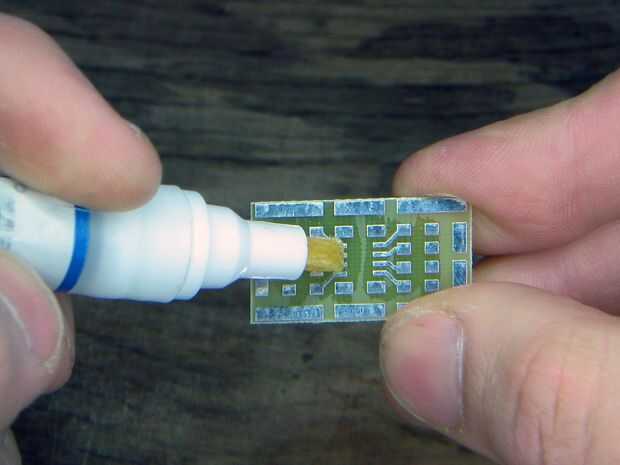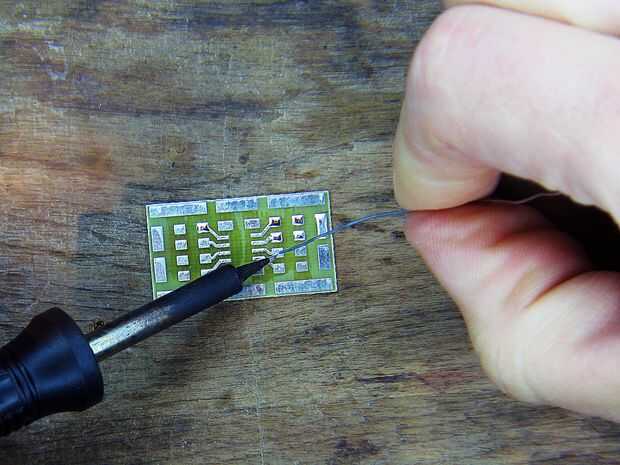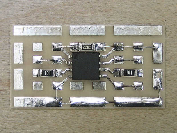 Hay un número de buenas guías en internet con ejemplos de como soldar componentes de montaje superficial. En general, quieres empezar poniendo un poco de soldadura sobre una almohadilla. El componente en un par de pinzas, calentar la soldadura y mantenga un lado del componente en la soldadura hasta que fluye en el pasador. Desea mantener la componente a ras con el tablero mientras estás haciendo esto. Luego, al otro lado de la soldadura. Ver la foto.