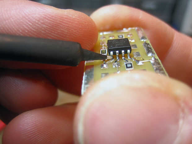 Otra consecuencia de no tener nuestra propia PCB hecho es que tenemos que lidiar con la inusual anchura de la viruta ATTiny45 que pasa a ser ligeramente más ancho que quepan cómodamente en la tabla de surf. La solución sencilla es doblar las patas hacia adentro para que el chip se encuentra en las almohadillas en lugar de sentarse en ellos.