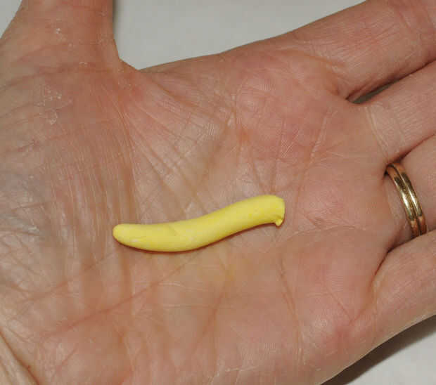Rollo de la arcilla amarilla en una bobina fina. Corte tres piezas 1 ½" larga y rodillo al final de cada uno en una lanza como forma.