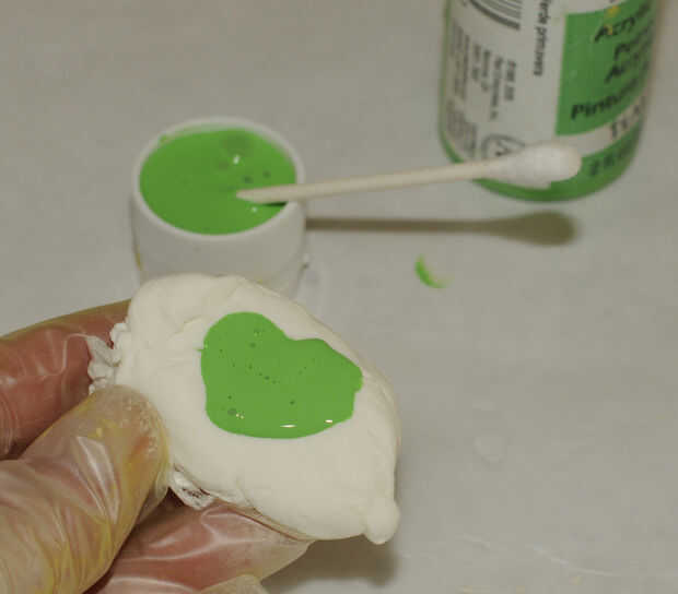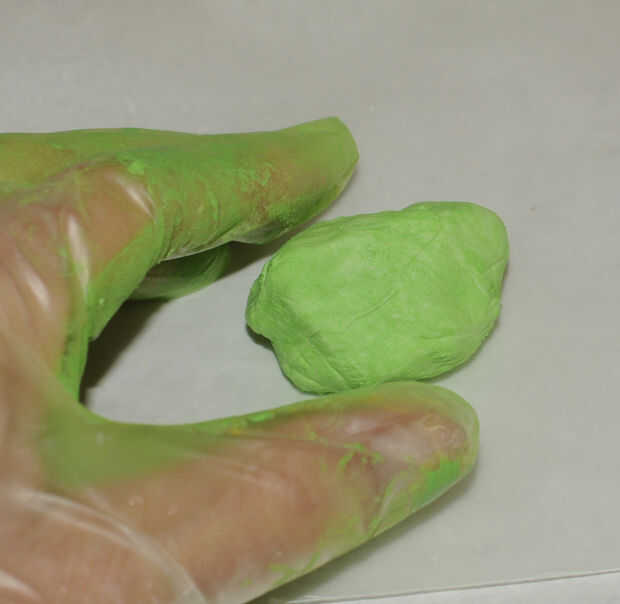 Tome otro trozo de arcilla y amasar en la pintura acrílica verde. Rollo de una bobina y corte en tres piezas.