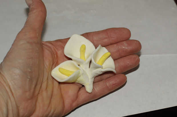 Hacer tres de estos lirios y póngalos en un trío. Puede que deba pellizcar apagado el tallo del lirio como se disipe. Utilice un poco de agua para adherirlos juntos.