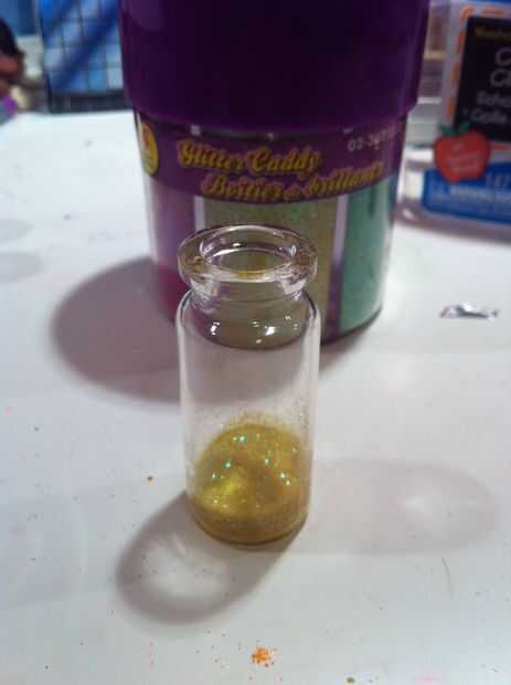 Ahora aquí está la diversión parte, escoger un color de brillo y agitarlo en la botella (esto puede ser difícil pero trata de no hacerlo por todo el lugar) si su padre es estricto sobre brillo, asegúrese de que está haciendo esto en un periódico o algo. Ponga la tapa en y sacúdalo para arriba!