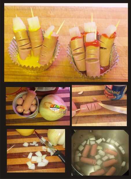Estos mirar casi reales! TAN bruto! Si no tienes las salchichas embutidos poco que vienen en una lata, cortar salchichas de tamaño regular a la mitad. Cortar unos nudillos en el lado y coloque en agua hirviendo durante 5 minutos. Agregue las cebollas en rodajas para hervir agua para utilizar como las uñas. Recorte la parte superior de la wiener un poco para establecer una rebanada de cebolla en como un clavo. Pegamento uñas con catsup o mostaza. Pincho con un palillo de dientes ala antigua de bambú chino bajo el estilo de tortura de la uña. Colocar en papel de Magdalena en la piscina de catsup o mostaza. Fingir que eres un caníbal.