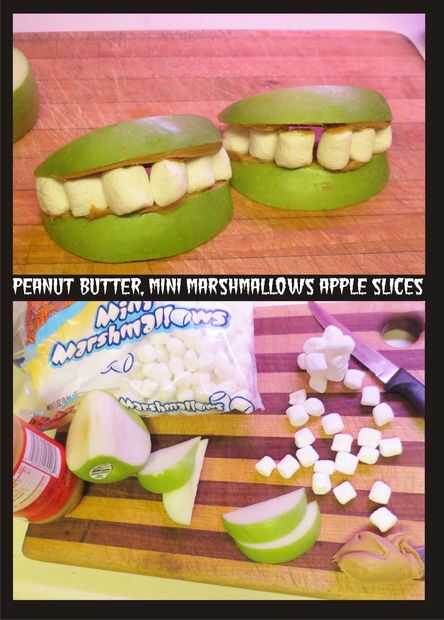 Son tan fácil! Sólo lavar y cortar una manzana. Separó la mantequilla de maní o caramelo, colocar mini malvaviscos para los dientes y de la tapa con otra rebanada de la manzana. Estos son lindos y muy delicioso. También puede reemplazar un diente de marshmallow con un arándano por un diente podrido. Bon Appetit!
