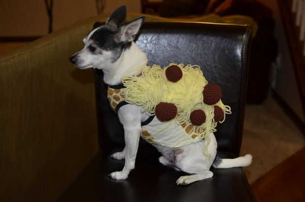 Para las albóndigas, ganchillo varius tamaño esferas rellenas con relleno de fibra y cosido en los "espaguetis".