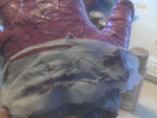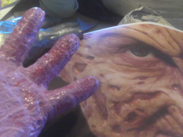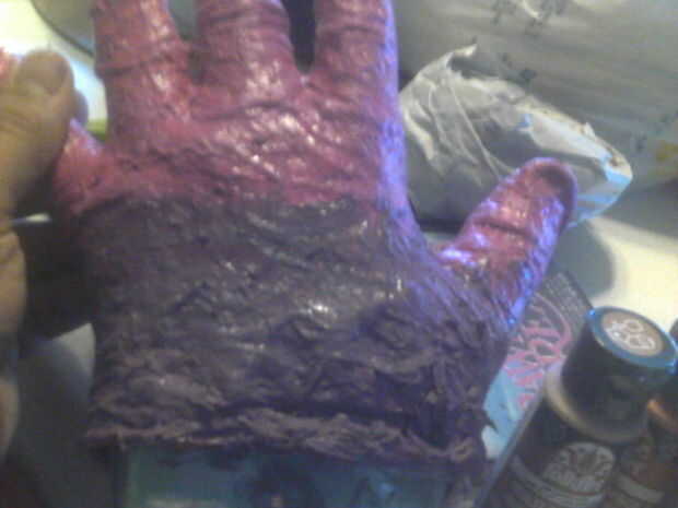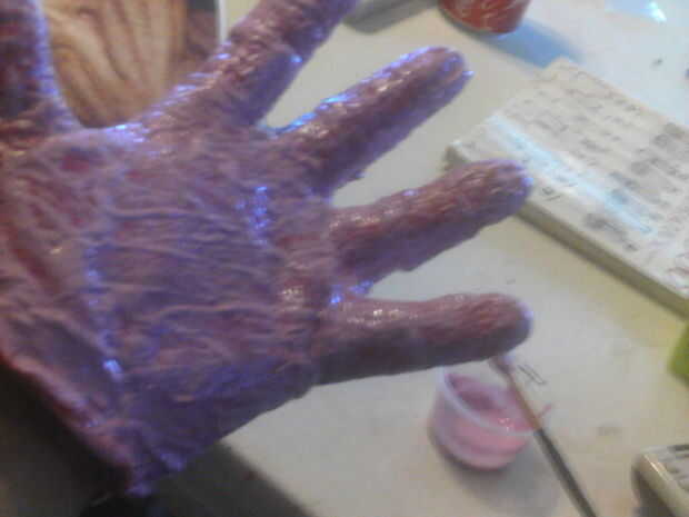 colocar el guante en mano. (izquierda) consigue fotos de referance. y la pintura a la estriación del músculo expuesto. (tuve que mezclar azul, rojo y un poco heather para conseguirlo)