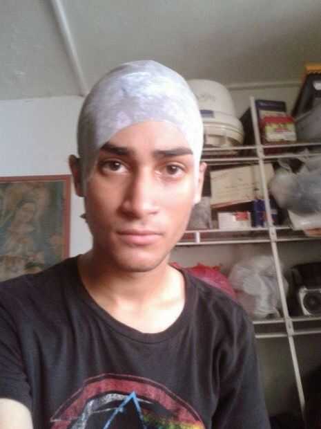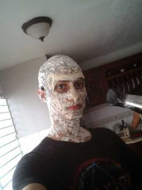 Luego aplique una capa de látex como base, luego aplicar papel higiénico con látex en la línea de la frente y nariz que cambiar sus proporciones faciales y luego poner otra capa de látex que sería úlceras por formulario, para acelerar el secado uso un ventilador en el frigorífico de aire nunca utilice caliente.