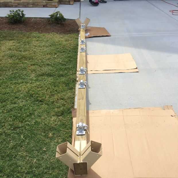 Puede que necesite utilizar un martillo y pinzas a los soportes en la viga, o posiblemente una escofina de cepillo en los bordes de la viga - que depende de qué tan seca la madera es y la tolerancia de tamaño. Por instrucciones de soporte, marca donde van los pernos de carruaje, luego perforar la viga con la 3/8" pedacito aburrido, teniendo cuidado de ir recto. Si falta la marca, tuvieron desde el otro lado y asegúrese de que es un camino recto a través de todo el camino. El soporte de la abrazadera en la viga bien e instale el perno de carruaje con una arandela, la arandela y la tuerca. Repita para el otro lado. Con pinzas al soporte firmemente contra la viga, utilice un taladro y el disco estrella para sujetar los tornillos a la viga a través de los 16 agujeros de los soportes. Ver foto 2.