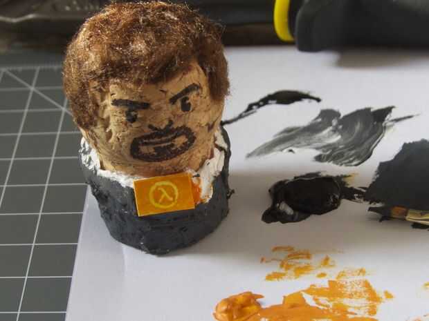 Cortar un pequeño rectángulo de la tarjeta que se ajuste el área plana inclinado y en un logotipo lambda amarillo sobre un fondo naranja. Pegamento en el área plana y pintar el resto del corcho, como se muestra arriba. Por último, esbozar los detalles con un marcador permanente negro.