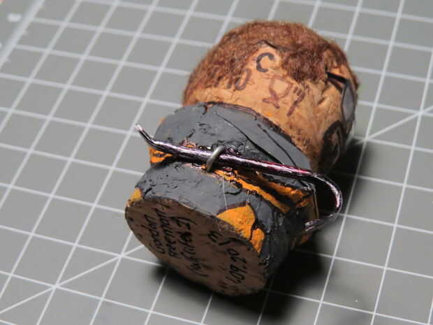Una vez que esté seco, instale la palanca hacia el lado del corcho fijación hacia abajo con un pedazo corto de alambre. Ahora usted también puede Agregar las gafas. Hice esto con algun pegamento de Krazy (sólo aplica pegamento a la nariz y en el pelo).