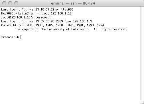 Ahora debe tener usted un pequeño saludo y un nuevo símbolo (loggin raíz es freenas: ~ # y como un usuario es >)