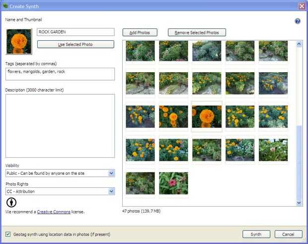 Escriba un nombre para el Photosynth y escoge una foto como tu imagen en miniatura.