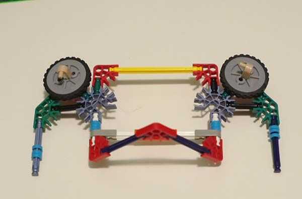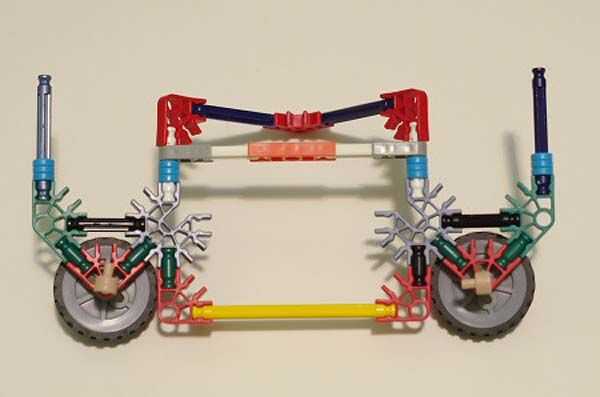 Para las ruedas, asegúrese de añadir a un espaciador azul delgado entre cada rueda y su correspondiente pieza de conector rojo. Es difícil ver en la imagen pero esto ayudará a las ruedas permanecer en el lugar y ser más estable.