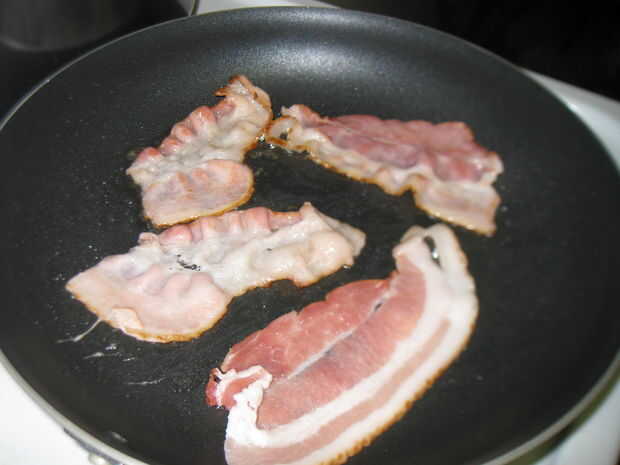 a la luz de freír el tocino queremos para asegurarse de que esté completamente cocido. Otra manera es difícil el disfrutar de la bondad que es tocino. Primero tomé un par de tijeras de cocina, aunque cualquier cuchillo haría y cortar el tocino a la mitad. Puede ser muy poco para los de estómago para manejar a la vez, para que control de porciones es clave. Luego, romper su fiel sartén y cocinar el tocino. Ahora para aquellos de ustedes por ahí que como el bacon crujiente, esta es la parte difícil. Usted necesitará parar en masticables, si no ligeramente insuficientemente cocida. Sólo sé que no desea que el tocino crudo o completamente cocido en esta etapa, habrá más cocinar, pero no suficiente.