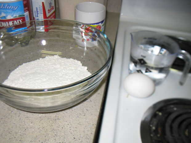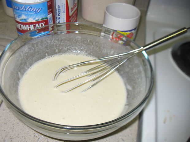Para armar la masa, mezclar el huevo y el agua y revuelva en la harina pero trate de no sobre mezclar. Usted quiere que ser suelto y ligero, el más usted lío con él, y más vencer, la más dura va a ser.