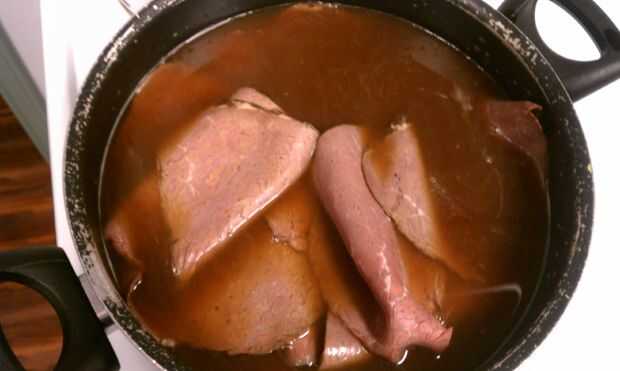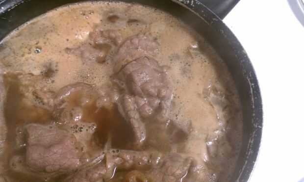 Después de la sopa de cebolla está hirviendo añadir su carne asada a la sopa. Probablemente deberás añadir algo más de agua, una vez que toda la carne en la olla. Hervir la mezcla hasta las arrugas de carne asada para arriba, cuando lo hace bueno para ir.