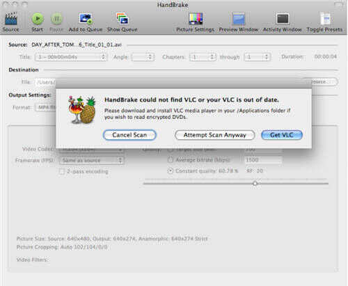 Una ventana se mostrará mensaje de "Freno de mano no se pudo encontrar que VLC o el VLC es obsoleto". Haga clic en "obtener VLC" para descargar la última versión del reproductor VLC.