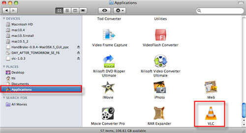 Para asegurarse de que el freno de mano puede encontrar el reproductor VLC, tienes que arrastrar el elemento VLC player en la carpeta de la aplicación.