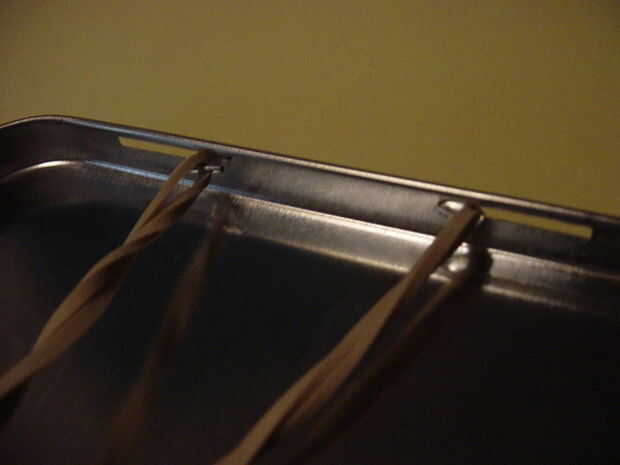 Poner a cada extremo de la goma bajo el gancho de clip dentro de la tapa donde tiene clip. Quizás tenga que afloje o apriete el clip hacia abajo para lograr esto, pero cuando termines, las gomas deben mantenerse en su lugar firmemente por el clip de papel.