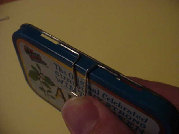Si usted dobla el clip correctamente, debe encajar muy bien en las ranuras de la bisagra en el lado de la tapa de Altoids.