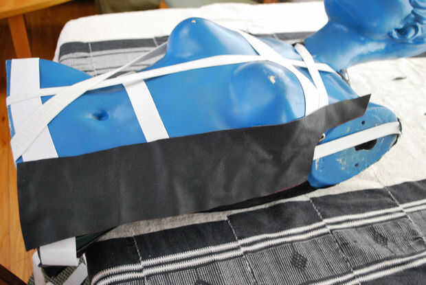 Cortado la pieza de patrón en la línea de lápiz azul limpio nuevo dibujó en el paso pasado y puso la pieza hacia abajo la piel otra vez, derecha. He medido 2" desde el borde de la costura lateral con una regla de plástico transparente y había marcado mi margen con el lápiz azul. En el fondo, I mide 1/2" del borde con la regla y había marcado en lápiz, entonces había agregado 3/8" a todas las costuras restantes y los marcados así. Me uní a la costura bajo el brazo con la costura lateral alineando la regla con las marcas de lápiz y rellenar la línea con el lápiz. Luego cortar la pieza de cuero a lo largo de las nuevas líneas de frescas y puso sobre la costura del lado izquierdo del maniquí para comprobar el ajuste. Me parecía bien, pero era demasiado pronto contar.
