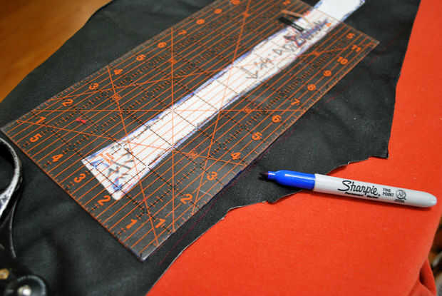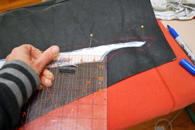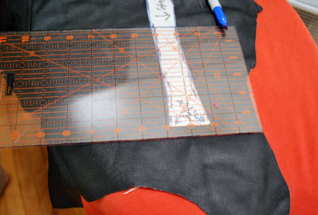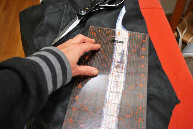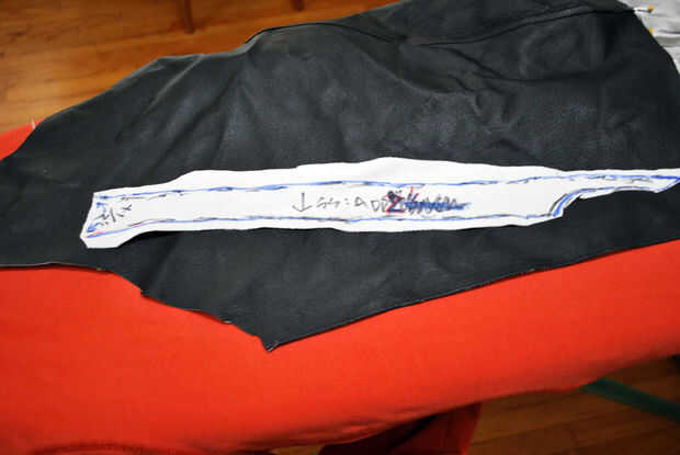 Primero para arriba he encontrado un trozo de cuero (parte de un viejo par de pantalones) que era lo suficientemente grande para mi pieza y las cantidades agregadas señaladas en el patrón. En este caso, necesitaba añadir 2" al lado de costura, 1/2" en el borde inferior y mi margen de costura de 3/8" estándar al interior borde, la parte superior y la sisa.