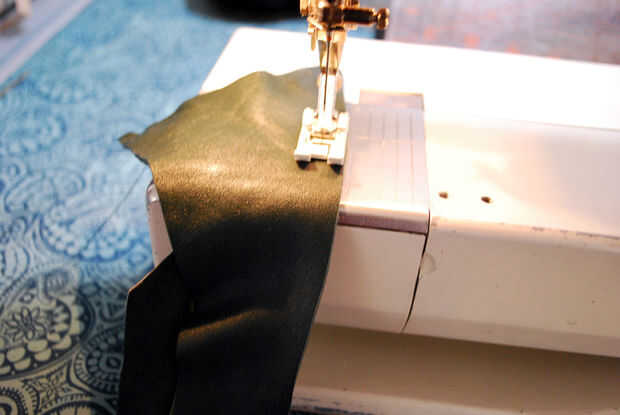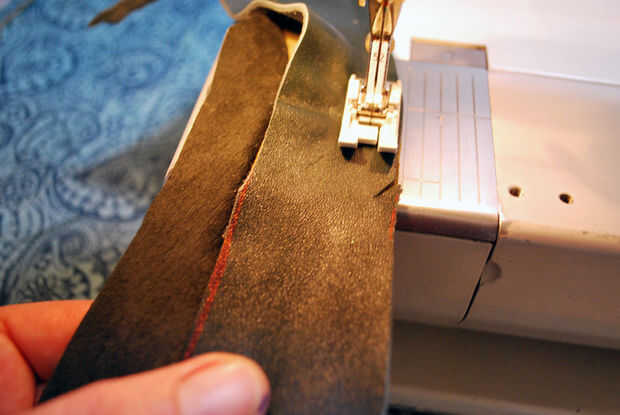 Puse la pieza #2 y #3 piezas debajo de la máquina de coser, así que ambos bordes alineados con el borde del pie de máquina. Había iniciado en la parte inferior, pespunteado y había cosido recto mi camino hasta el lado hasta que me dieron aproximadamente 1" de ese pequeño recorte en la piel. Desde ese momento, cosí los bordes de cuero justo fuera del borde del pie de máquina. La obra tendría un poco más pequeña, pero pude corregir para posteriormente. Coser el resto de la costura, pespunteado, corte mis temas y sacó las piezas debajo de la máquina. Entonces recorta el margen de costura a un escaso 1/8". El snip desapareció sin dejar rastro.