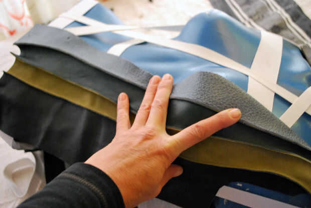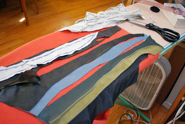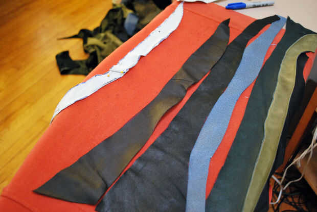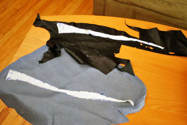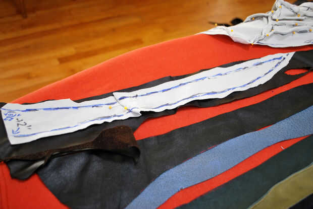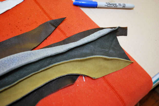 Luego hasta sacó cuero a utilizar para cada uno de los patrones preparados. Pieza #4 solía ser la parte posterior de los Driven, la silla eduardiana de Cyborg, y las piezas 5 y 6 (respectivamente) fueron rock & roll sobras y desechos de sillón. Dibujaba en los márgenes de costura y los complementos en el borde inferior de las piezas 4 y 5 y cortar el cuero. Entonces yo cortar pieza #6, probando primero el ajuste del patrón en el retal de cuero.