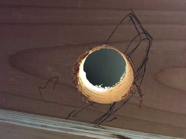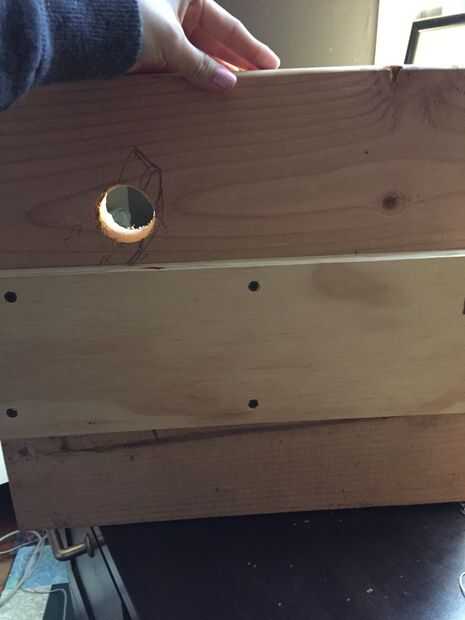 Yo trabajaba con dos piezas de madera. Para amoldarlos en una sola pieza, me corte a la forma correcta usando una sierra y luego agregó una pieza de apoyo en la parte posterior de las dos piezas conectado un tornillo. La viga de apoyo ayudará a mi pieza soporte apropiadamente más adelante en y conecta las dos piezas de madera. Una vez que se conectaron mis dos piezas, luego continué cortar un agujero para mi toma de corriente utilizando el orificio de la sierra. Me aseguré con una cabeza que le corte un orificio de diámetro 4 cm, el tamaño general para la mayoría de sockets.