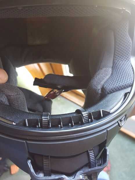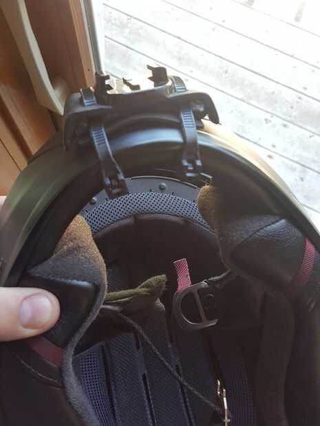 Trate de tener en cuenta la orientación de los lazos del cierre relámpago. Es difícil de explicar... poner la hebilla hacia abajo, con la entrada mirando hacia en el casco. Lleve el extremo a través del agujero inferior en un lado del soporte. Lazo sobre el soporte e introduzca en el orificio superior. A continuación, ejecute el cordón a través de la rejilla de ventilación frontal, ranura en la segunda. Ahora, simplemente inserte el extremo de la hebilla y apriete firmemente, pero suavemente. Repita este proceso para la segunda amarra en el otro lado. Asegúrese de que la estera de goma se queda centrada entre el casco y el soporte también.