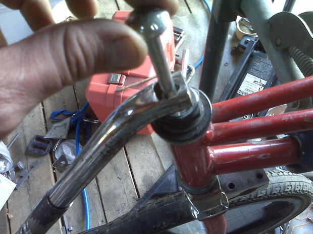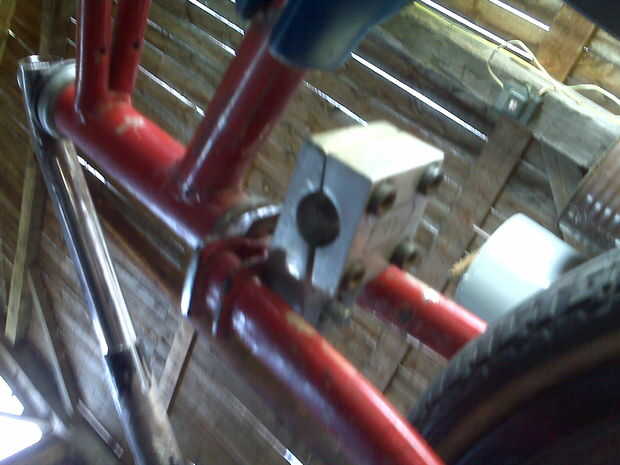 Puesto que el diámetro interior de la horquilla en la parte inferior es más pequeño que en la parte superior decidí molido o arena/archivo hacia abajo el tallo sí mismo para reducirlo suficiente para caber. El ajuste era todavía muy apretado y tuve que conducir en el uso de calor y un martillo de golpe muerto. Utilizando un 10 "x 3/8" perno de carruaje hacia abajo aunque la tija y horquilla fue utilizado para ambos casarse con el triángulo delantero a la parte posterior, pero también para sujetar firmemente el vástago en el lugar.