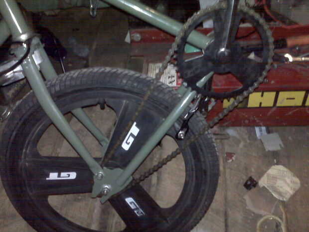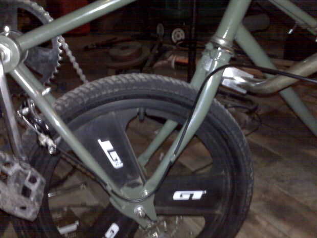 Para empezar, no hacer un 'ajuste seco' de la bicicleta antes de la soldadura. Este error se convirtió en más claro al instalar el freno delantero y juego de pedalier. El nuevo puente de freno que soldado con autógena en el triángulo delantero es en una situación muy difícil. Como se puede ver en las fotos (2ª foto), el freno está muy cerca de la línea de la cadena, aunque no interfiera con la operación. Sin embargo, en el lado no motriz el brazo de manivela girada contra el brazo del freno. He intentado diferentes maneras de corregir el problema, pero herida por presentar frena el brazo ligeramente, lo suficiente como para darle unos cuantos milímetros de separación (Foto 3).