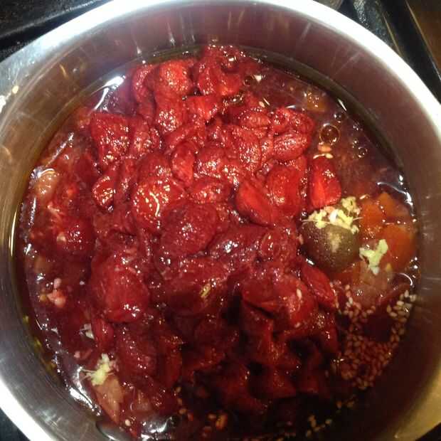 En una pequeña cacerola pesada, añadir las fresas asadas refrigeradas (utilice una espátula de punta suave para raspar cada pedacito del jugo en).