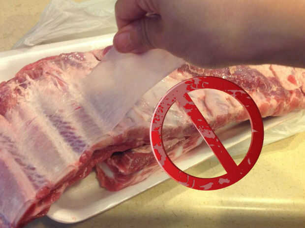 Recorte de grasa pero no quitar la membrana que ayuda a mantener las costillas en una sola pieza cuando la carne es caerse los huesos al final del período de sesiones de cocina lenta, así que usted puede asar o asar a la parrilla para conseguir ahumados a la parrilla sabor.