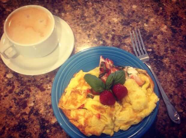 Fresa, albahaca, tortilla de desayuno de queso de cabra
