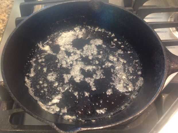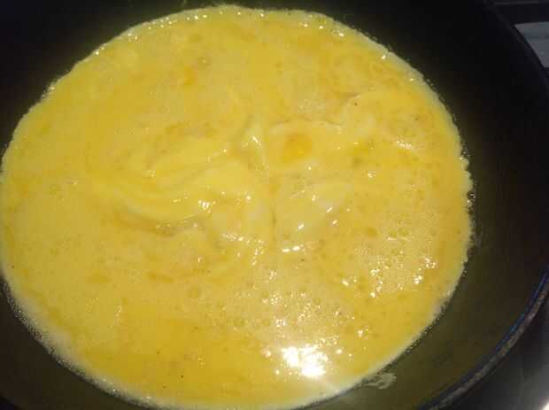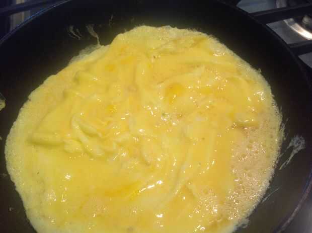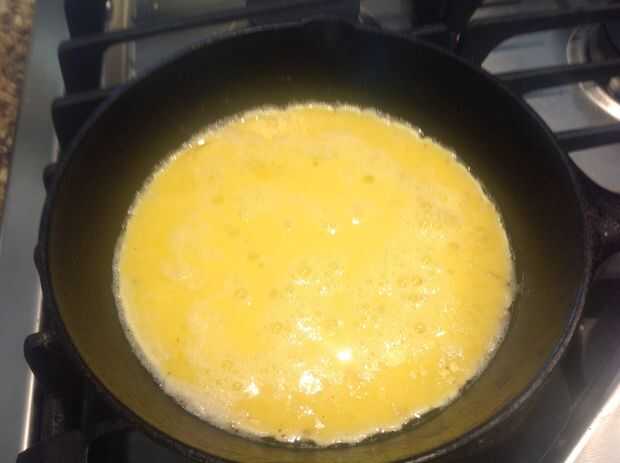 Derretir la mantequilla y el pan agradable y caliente. Vierta los huevos y gire el calor al medio. Trato de no moverse alrededor de mucho, pero tire los huevos cocidos en el centro para que el huevo crudo fluye debajo y cocineros.